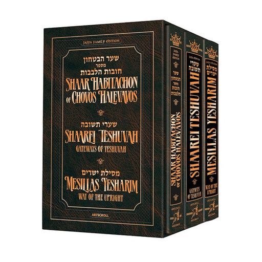 View full detailsIncludes: Shaar Habitachon, Shaarei Teshuvah and Mesilas Yesharim Three mussar classics in one convenient slipcase set: The Jaffa Edition Shaa...
