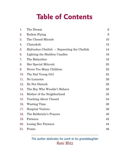 Now, he introduces young readers to one of the most beloved figures of our time - Rebbetzin Batsheva Kanievsky. Our children (grandchildren too!) will love the stories about Rebbetzin Kanievsky's legendary devotion to Torah and her kindness to others, carefully chosen to interest and excite young readers. TheyÂ’ll love the beautiful full color illustrations by Lea Kron. And, especially, they will love Rebbetzin Batsheva - because they will feel her endless love for them!