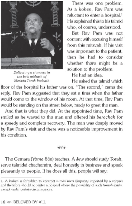 The caller was sad and lonely. The speaker was Rabbi Avrohom Yaakov HaKohen Pam, Rosh Yeshivah of Torah Vodaath, where he taught Torah to thousands of talmidim for sixty-three years. After speaking to his "friend," the caller was less troubled, and surely less lonely.