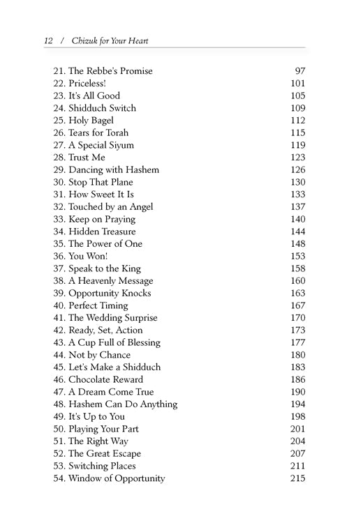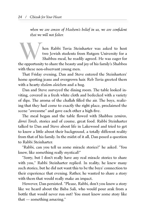 We meet a suffering patient in Sloan Kettering, joyously dancing hakafos around his hospital bed, IV pole in one hand, a sefer in the other -- and our hearts are strengthened. A random encounter in a gym has eternal results, showing us clearly that nothing, but nothing, in this world is really "random" -- and our hearts beat with renewed faith. In a bagel store, a tzaddik's grave on a mountaintop, on the other side of the planet or in our own backyards, Rabbi Pruzansky finds stories both fascinating and inspiring, stories that elevate our spirit. And strengthen our hearts!