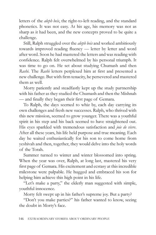 Extraordinary Stories about Ordinary People is an inspiring collection of true stories about real people who chose well, who chose wisely, and who, without publicity or fame, achieved greatness. It is the story of people like Ralph Shwebel, a Jewish wrestler who longed to learn Talmud, and who was eulogized by Rav Moshe Feinstein zt'l himself. It is the story of two Jews and a loaf of bread in Auschwitz. It is the story of Reb Betzalel, the "milkman" of Shaarei Chesed, with his unusual views of new-found wealth. It is the story of people struggling with overdrafts or with death, with shidduchim or hunger - and it is the story of how Jews take their struggles and transform them into triumphs.