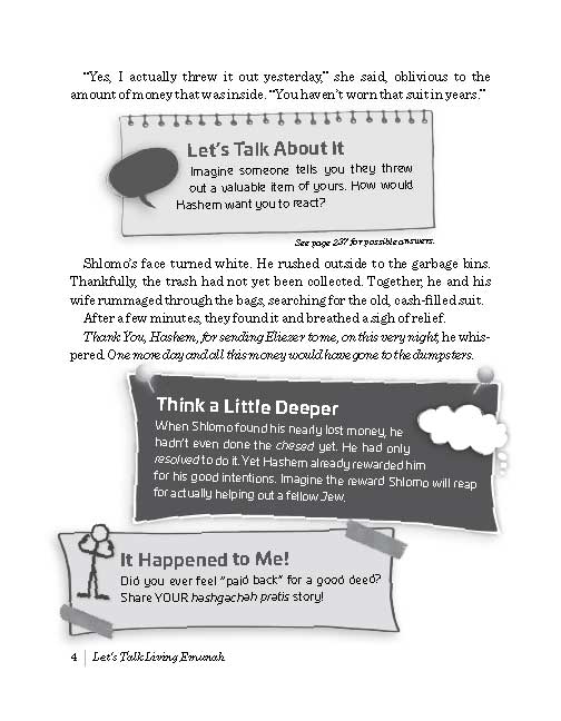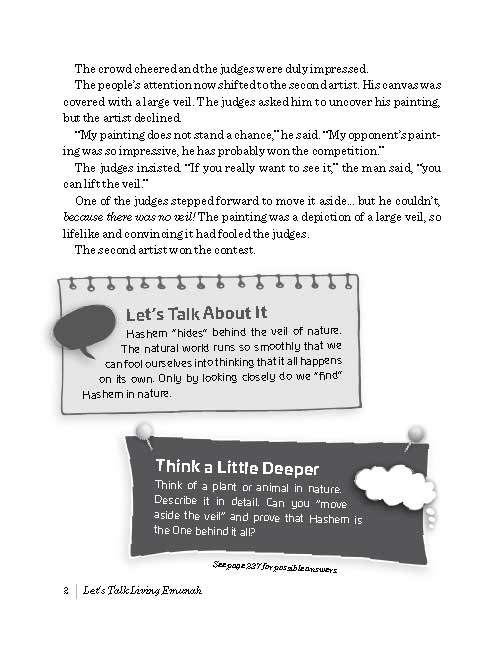 Let's Talk Living Emunah is not made to be read alone. It is for the parent, grandparent or older sibling to read with the children, for the educator to read with the class.