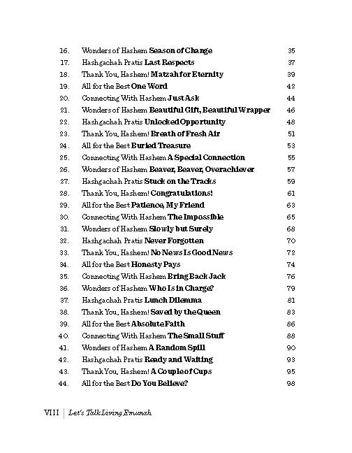 Together, children and adults will explore the wonders of Hashem's world and His hashgachah pratis, They will learn to thank Hashem for all the good in their lives, and see how everything works out for the best. And while they are strengthening their emunah -- they will also be talking to each other, strengthening their relationships at the very same time.