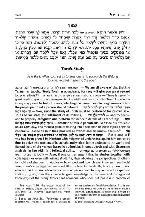 Pele Yoeitz is an encyclopedia of Jewish ethics, prayer, behavior, guidance, and thought authored by the renowned 19th-century halachic authority, ethicist, and kabbalist Rav Eliezer Papo. Pele Yoeitz was written two hundred years ago, but it speaks to our generation as if it were written today. The author covers a wide variety of topics, in alphabetical order, from aleph to tav. He doesn’t preach or rebuke. He teaches and discusses. He leads us by the hand. He blends higher aspirations, demands for growth, and an astounding command of Torah sources with a keen awareness of human nature. The serious reader cannot fail to be inspired to grow.