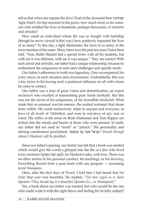 This warm, riveting book is more than a biography. It is a guidebook in how to be a successful teacher or parent, and how to be a Jew whose every word and deed brings glory to Hashem. In the words of his lifelong friend, Rabbi Yitzchok Scheiner, Rosh Yeshivah of Yeshivas Kaminetz in Jerusalem, “"I am certain that reading about Reb Manis zt"l can make anyone a better Jew."
