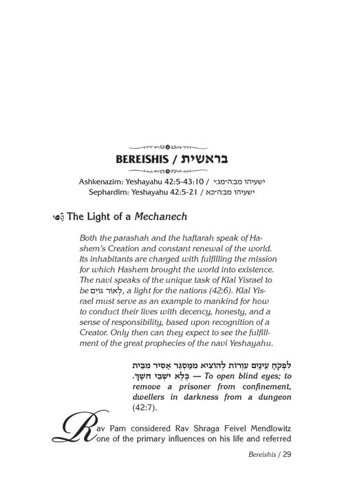 Rav Pam had a unique way of combining the messages of the Torah with a deep understanding of human nature, interpersonal relationships, and the many factors necessary to make a human being into that indefinable entity- a "mensch." The haftarah of Parashas Chayei Sarah teaches us a lesson in dealing with rebellious teens; the navi Yeshayah's words in the haftarah of Parashas Vayikra show us how to deal with charity in financially turbulent times.