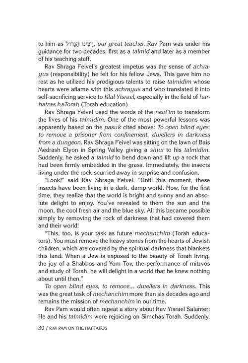 Rav Pam on the Haftaros will give us a weekly burst of spiritual energy, as we "hear" his sweet, beloved voice guiding us through the challenges of life with the eternal wisdom of Torah.