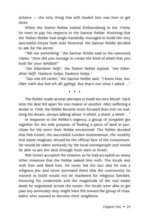Bestselling author Rabbi Nachman Seltzer shares with us Reb Getzel’s dramatic life and extraordinary achievements. We meet the young man whose passionate love for a mitzvah sends him to the world of real estate, where he becomes more successful than anyone could have imagined. We see him become one of the major forces behind the construction of Reb Yoelish’s “shetl,” Kiryas Yoel. We see his endless generosity when it came to building Torah or saving Jewish lives -- and the marvelous simplicity of his own lifestyle.