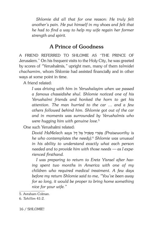 Shlomie was, in his own words, "a regular guy." He was wrong. People who knew him recognized that in his chesed and love of fellow Jews he was one in a generation. He revered gedolei Yisrael and they in turn loved and admired him. They knew that his was the shoulder that every poor man, every widow and orphan, could lean on for support.