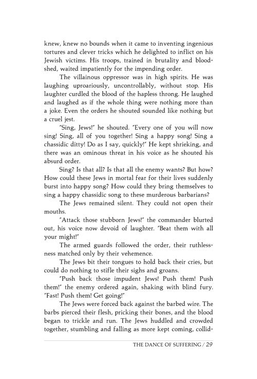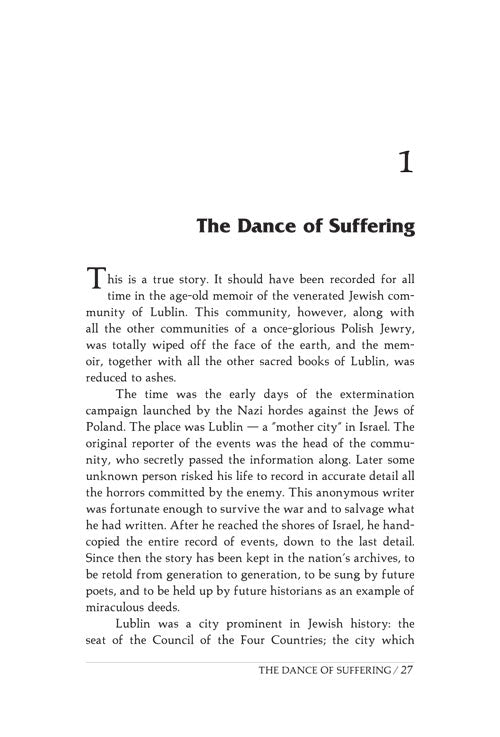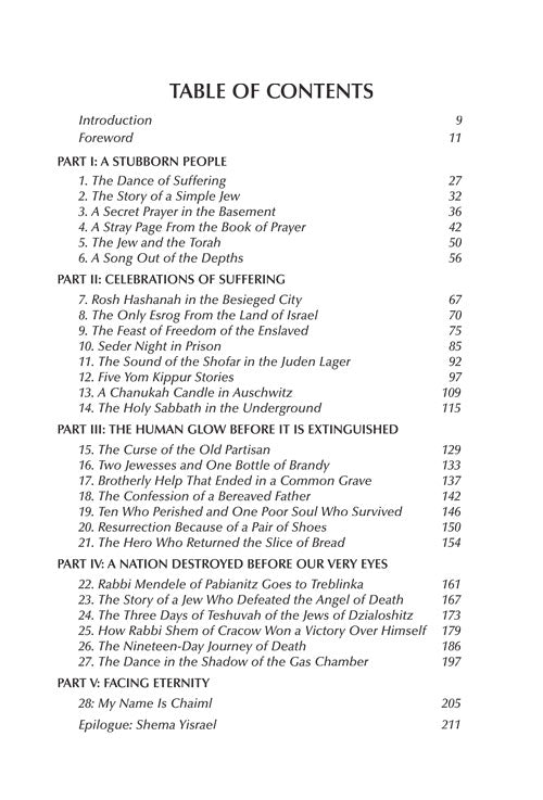 They told him of astounding heroism, of inspiring loyalty to the traditions of Israel. They told him about little Shmulik, beaten mercilessly by Pole and German, who pleaded with his frightened father," Haven't I had my share of blows? I, too, am a Jew. I, too, want to pray.." They told Prager about girls in a slave labor camp who fasted on Yom Kippur. About a "simple" Jew who risked death in seven different camps by putting on Tefillin every day. Of Rabbi Adam, being systematically tortured every day, yet insisting to his comrades that it is better to be a victim than a murderer.