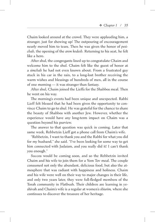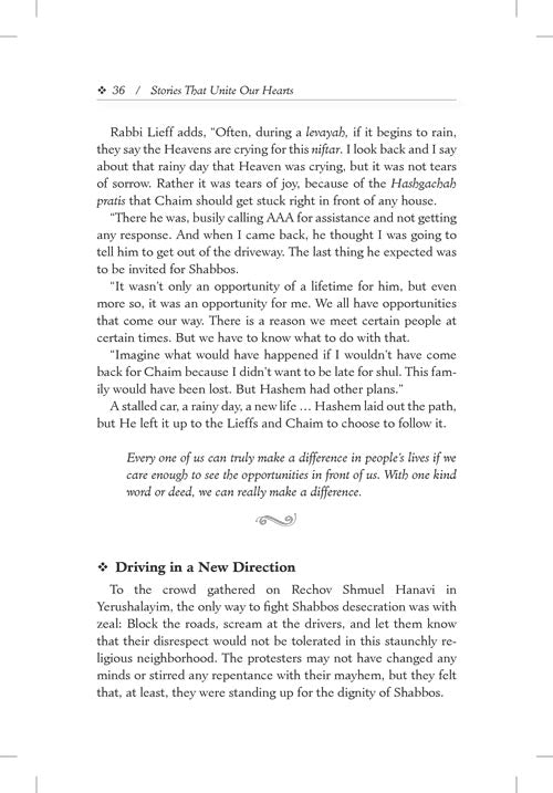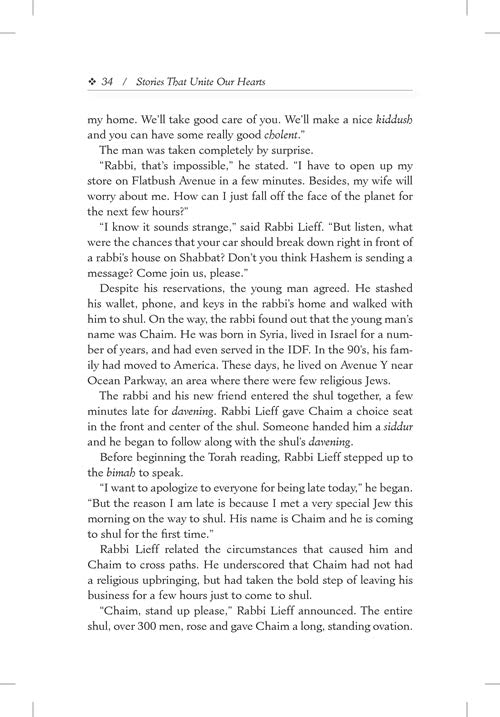 A man's car breaks down in front of a rabbi's house on Shabbos, and his life takes a u-turn towards Torah.