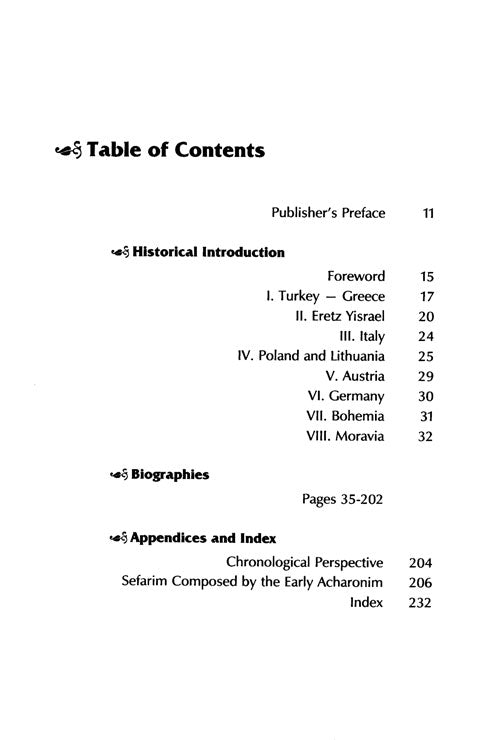 Following the tradition of its predecessor, The Rishonim, this book has been exhaustively researched and has been years in the making. It includes maps, charts, and indices, among them in index matching authors with their most important works. In addition, it contains an introduction providing a historical perspective on the spread of Jewish settlement and the development of new communities.