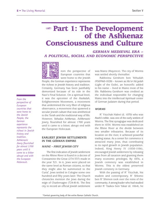 From its humble beginnings in Mainz to its shockingly swift and brutal end at the blood-soaked hands of the Nazis, the Jewish communities of Ashkenaz were a vital link in the chain of Torah transmission, a vibrant and important part of Jewish life and thought that has influenced Jewry to this very day.