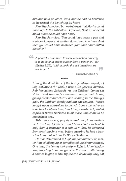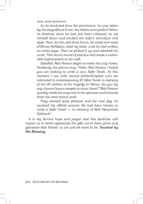 Touched by His Blessing brings us inspirational insights, fascinating halachic discussions -- and, of course, stories. Stories of both famed tzaddikim and simple Jews who said Bircas HaMazon with devotion and love. We will meet the Jew who survived as “the chef of Auschwitz" through his care in bentching. We’ll gaze with wonder upon the siddur used by the Ba’al Shem Tov -- and at its pages of Bircas HaMazon, stained with his tears. We will read stories about the amazing power of Bircas HaMazon to protect our property, our livelihoods, and transform our very lives.