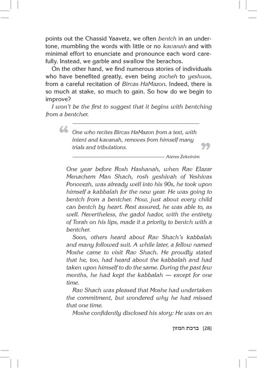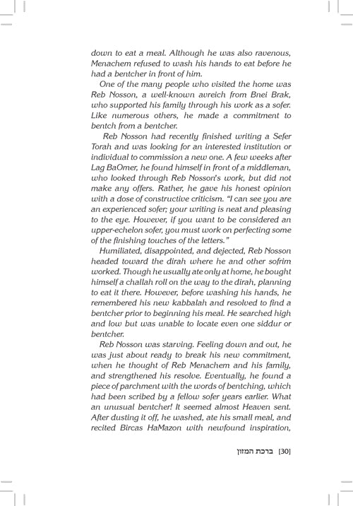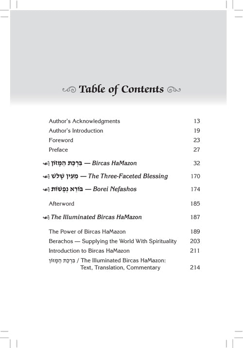Special section: Chofetz Chaim Heritage Foundations Illuminated Bircas HaMazon featuring text, linear translation, inspirational commentary and illustrations; also available in full color from Chofetz Chaim Heritage Foundations.