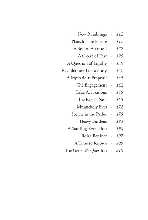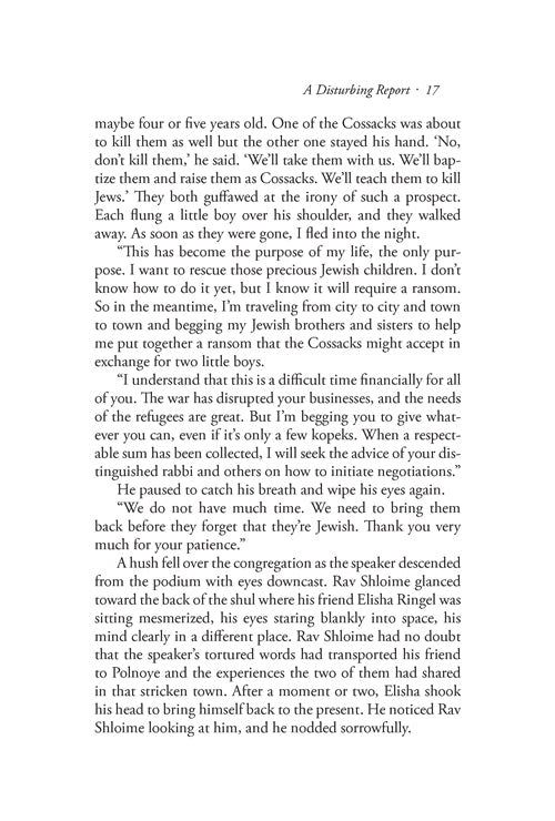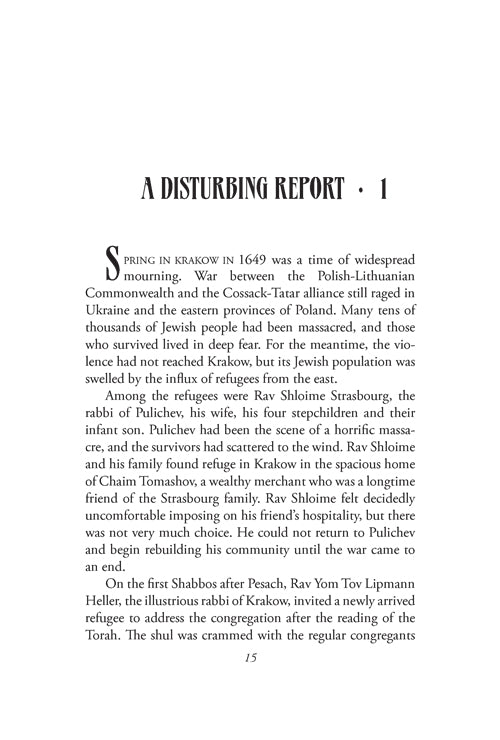 During these years, the massacre of countless Jewish people finally came to an end, but the painful memories were still fresh in the minds of the survivors. The Jewish people still suffered from the violent convulsions shaping Poland and all of Europe in the middle of the seventeenth century, convulsions that had not yet run their full course. As the story begins, a report of twins abducted by the Cossacks during the massacre at Tulczyn spurs Elisha Ringel to action. He manages to secure a meeting with Bogdan Chmielnicki, the hetman of the Cossacks, in his headquarters in Zaporozhiye, and the exciting story unfolds from there, coming to a climax in Warsaw nine years later. In the course of the story, we also meet Rav Shabsi Kohein, the Shach, and follow the turbulent events of his life through the eyes of Rav Shloime Strasbourg, rabbi of Pulichev.
