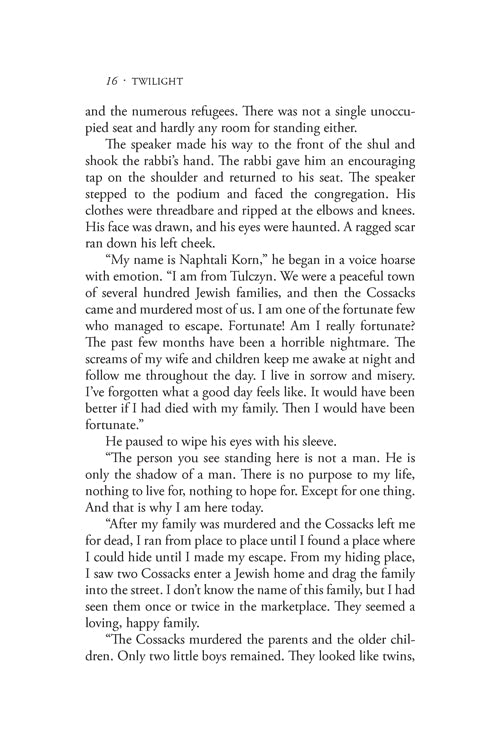 Twilight is that fragile moment that is not quite night and not quite day. The period described in this book was a twilight time. The wounds of war were not yet healed, but there was hope once again. A darkness of different kind, however, loomed in the future. The next installment in the Saga, The Impostor, describes what happened when Shabbesai Tzvi triggered one of the most disastrous episodes of our history.